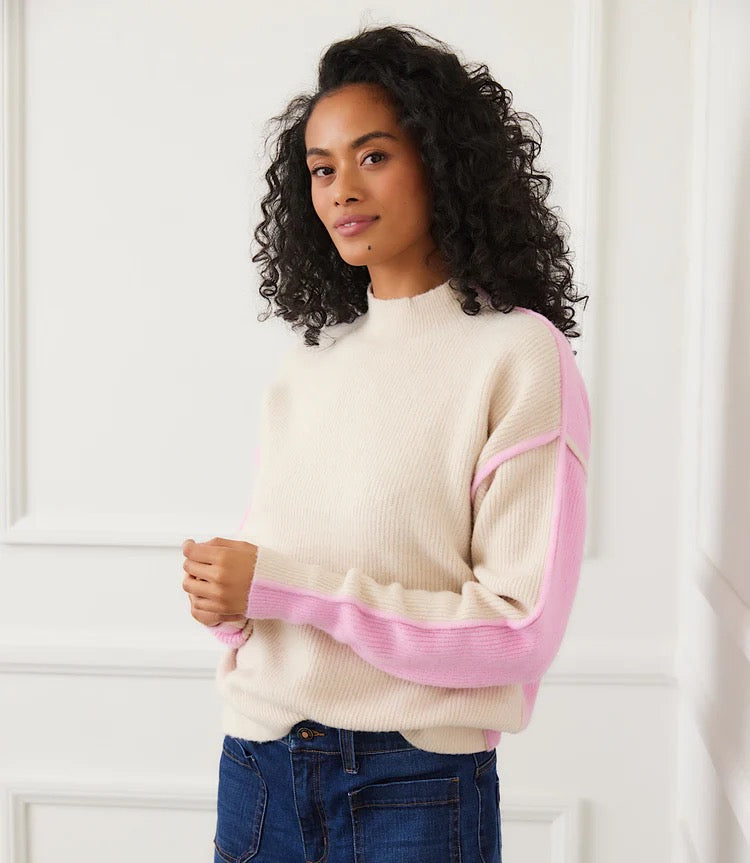 Featuring striking colorblock paneling along the sleeves and shoulders, wrapping to the back for a bold twist. An exposed seam at the armholes adds an unexpected edge, while a clean mock neckline, dropped shoulders, and relaxed fit enhance its effortless appeal