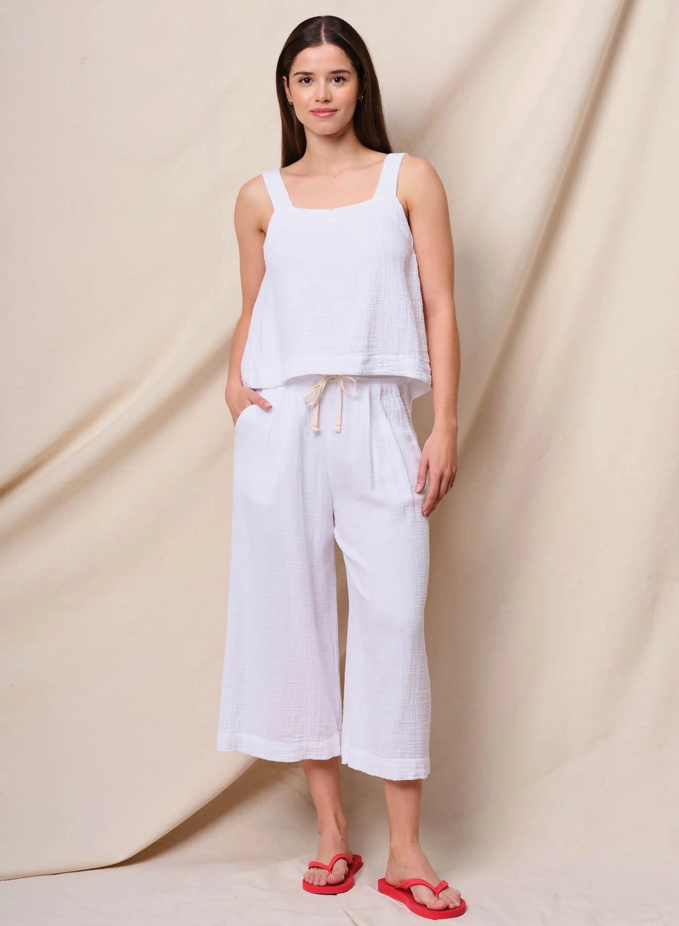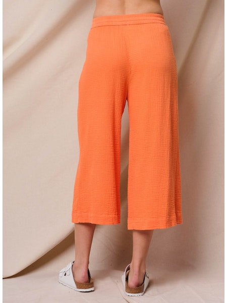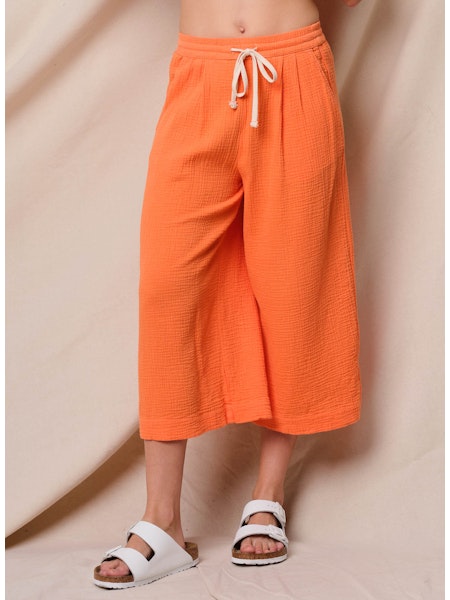 These wide-leg trousers in a bold, sun-kissed orange offer breezy comfort with a relaxed fit and soft cotton gauze texture. Featuring a drawstring waist and cropped length, they’re the perfect blend of effortless California cool and laid-back French chic.