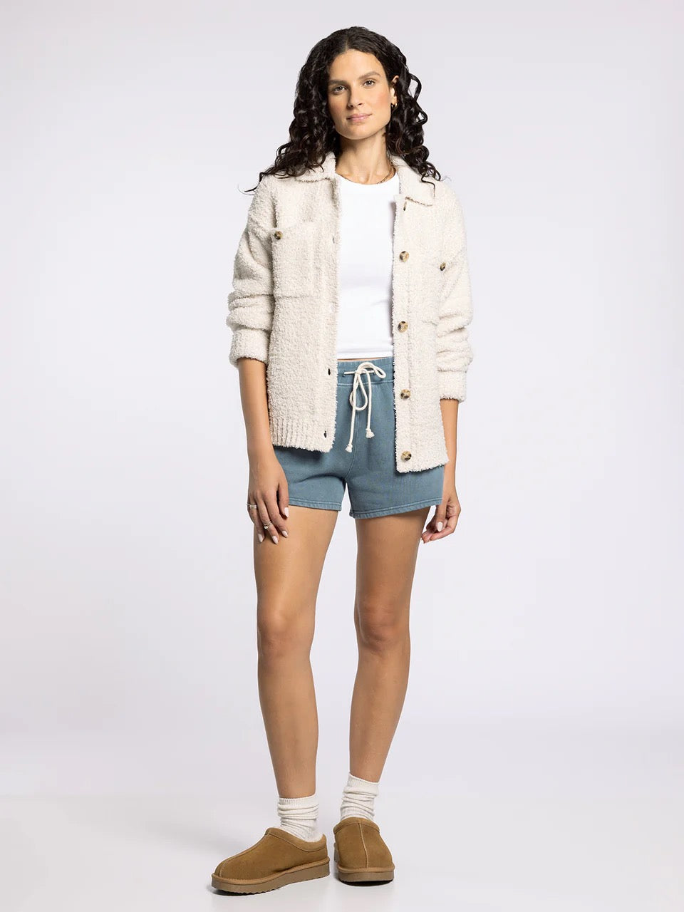 The best of both worlds, this so-soft sweater jacket is featured in a plush fabrication with a button front closure and dual patch pockets.