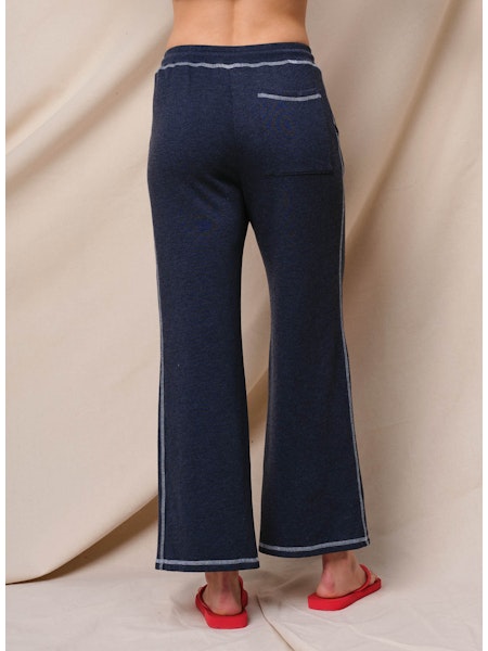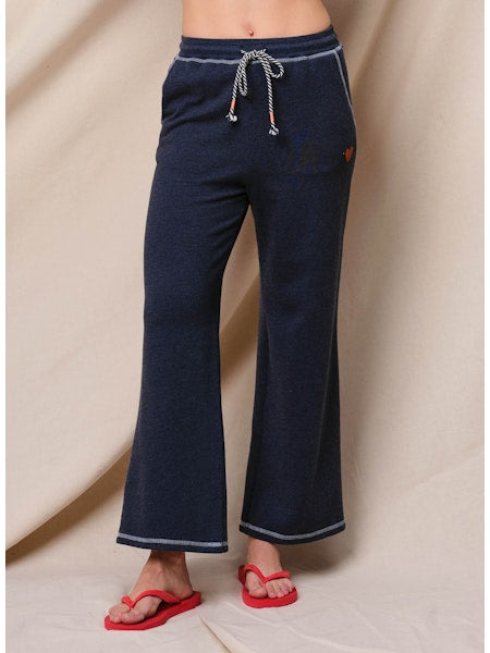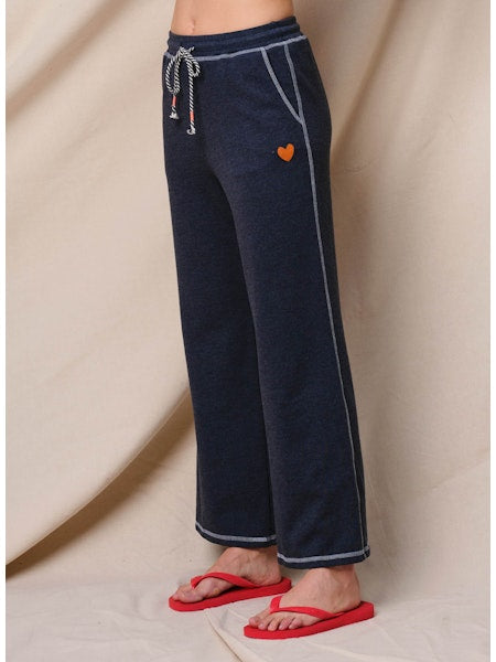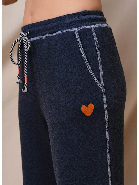 These deep navy lounge trousers offer an effortlessly cool take on comfort, featuring contrast stitching, a wide-leg silhouette, and a bold striped drawstring. Finished with a sweet embroidered heart at the hip, they’re perfect for cozy mornings or laid-back strolls with a hint of playful charm.