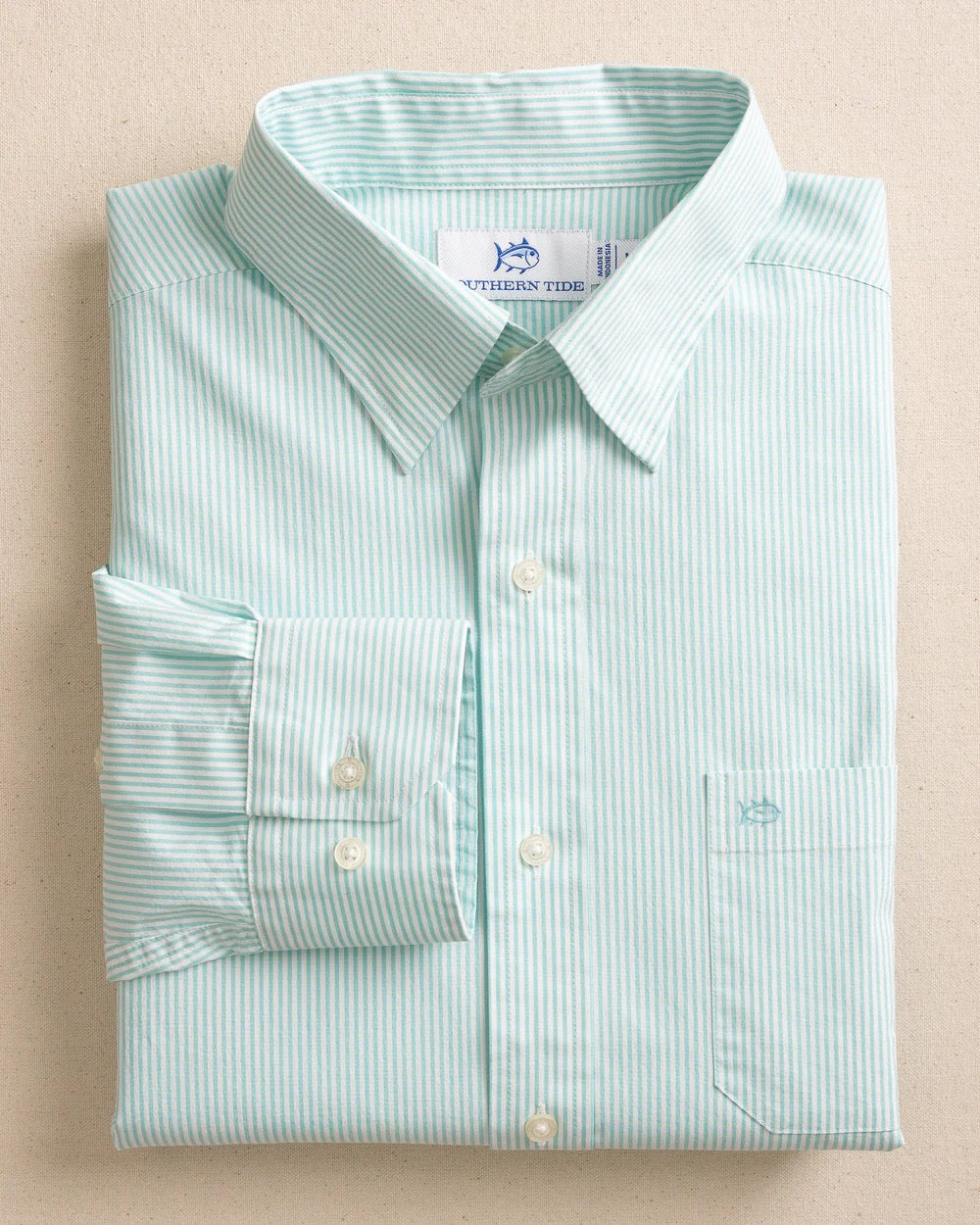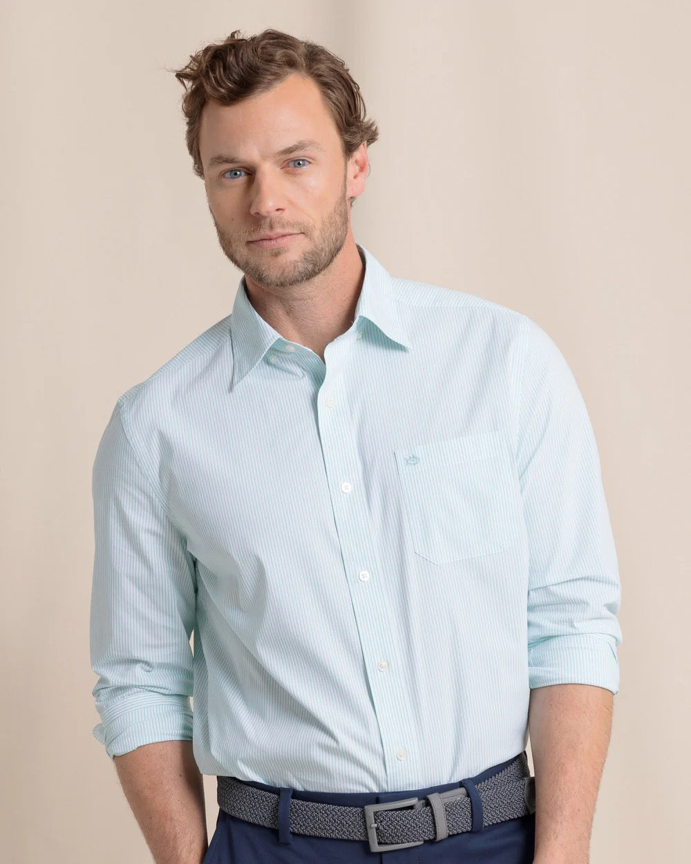 Earn your Southern stripes in this sport shirt. This beloved button-down is built for style and comfort, making you the epitome of timeless sophistication. Featuring a blue and white pinstripe pattern, this long-sleeve shirt is constructed from flexible, cooling materials.