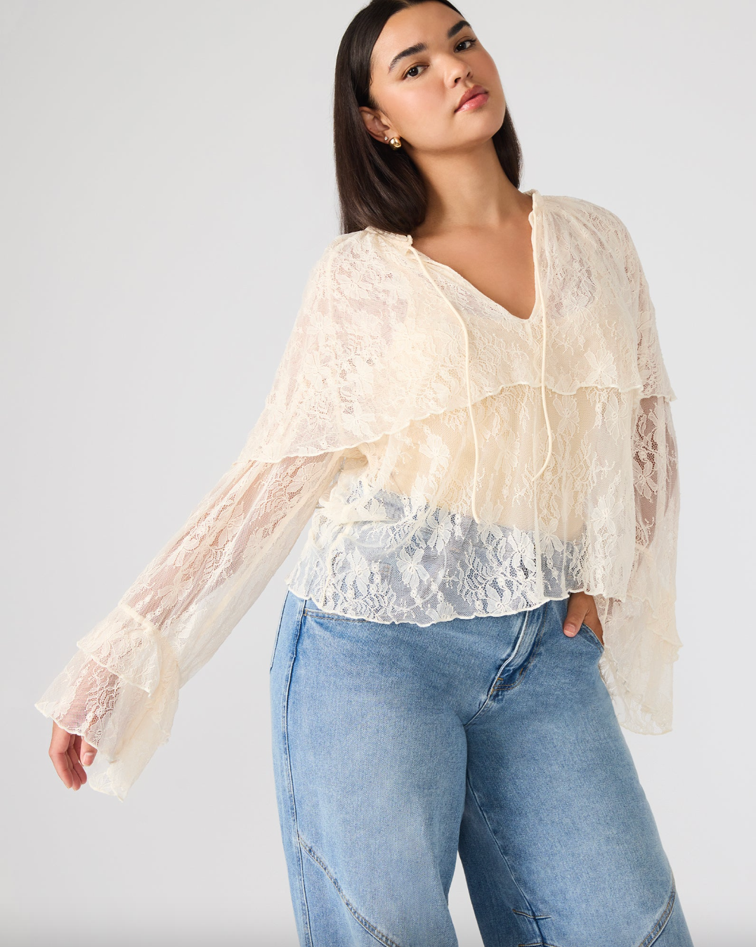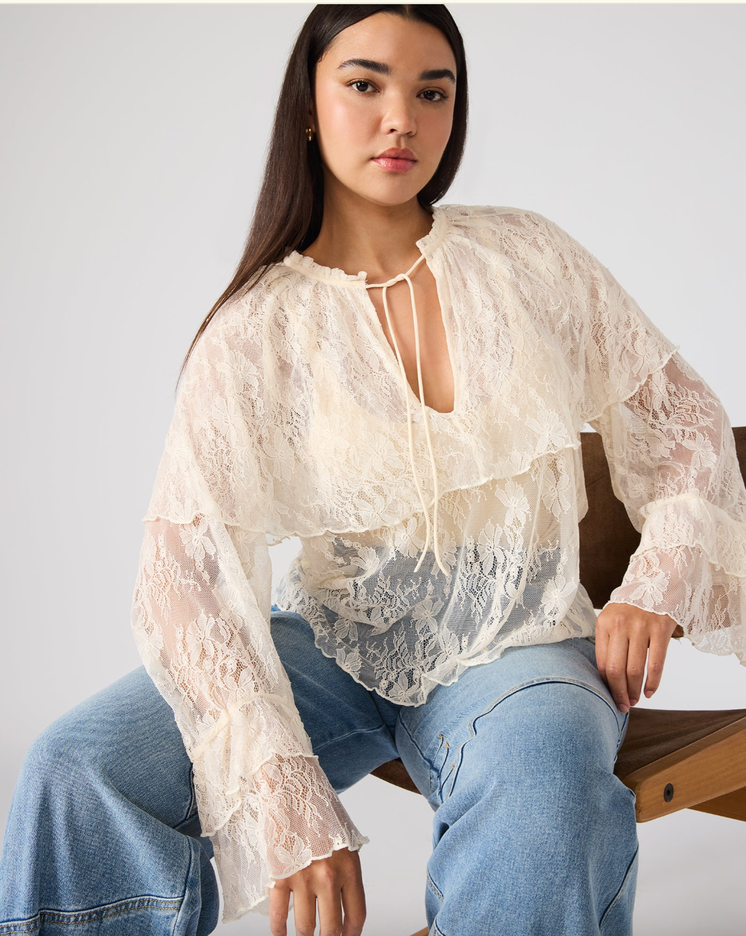 The SAYLOR top features a refined lace design with long sleeves, offering a blend of elegance and sophistication. Crafted to provide a delicate texture and subtle transparency, this top is ideal for layering or wearing on its own for a polished, expert look. Its timeless style and detailed construction make it a versatile addition to any wardrobe, perfect for both professional settings and stylish evening occasions.