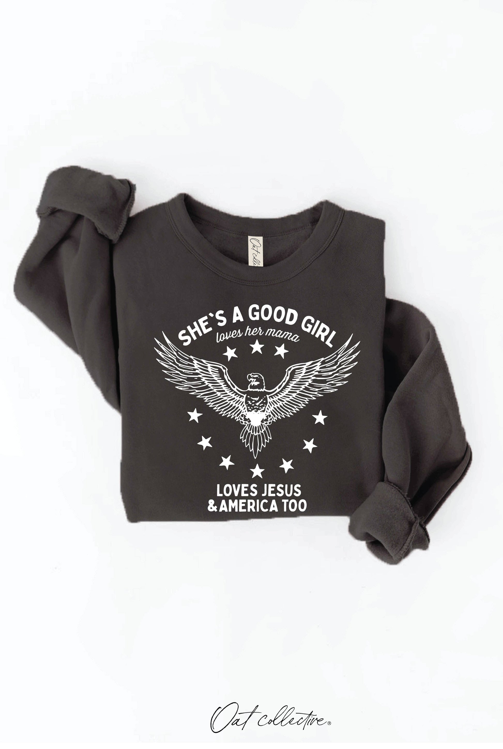 SHE'S A GOOD GIRL LOVES JESUS & AMERICA TOO PULLOVER Graphic Unisex Fleece Pullover Relaxed Fit.