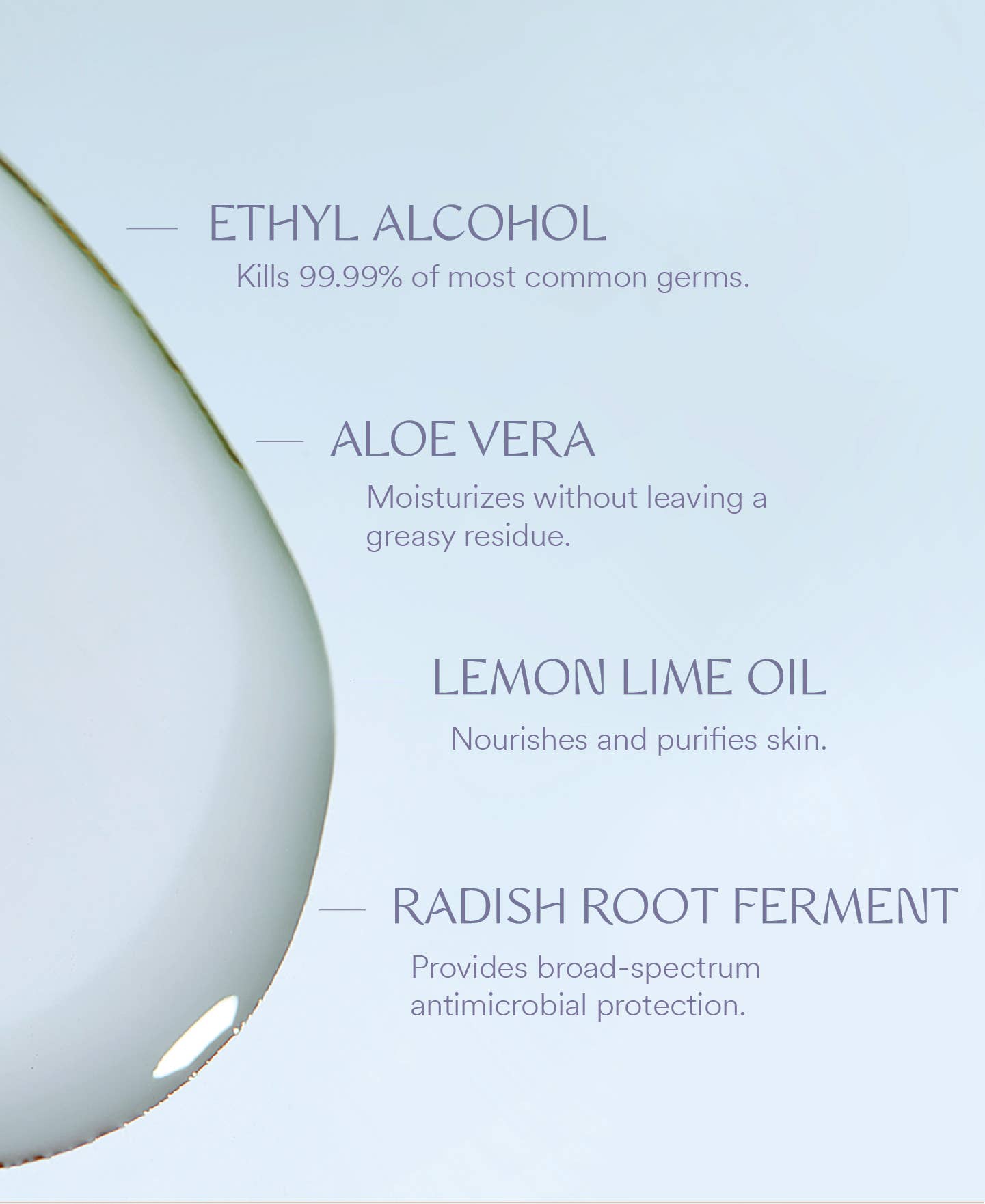 The award-winning hydrating hand sanitizer mist that feels as good as it looks. Rainwater Scent: Run your fingers through a natural spring, where the cool stream meets salty lime, transparent florals and tender woods.