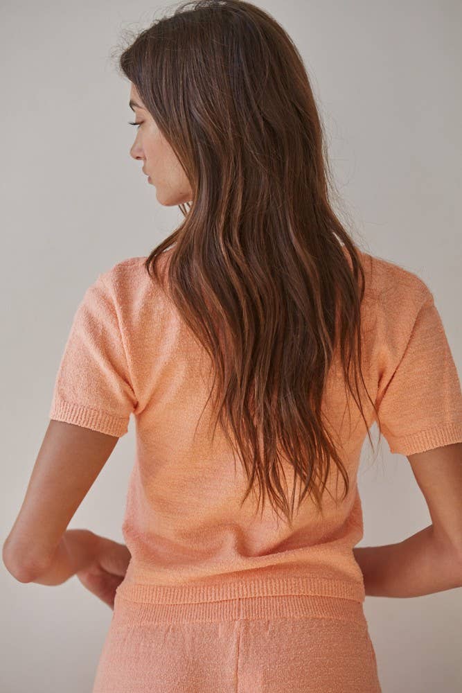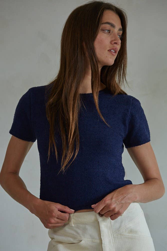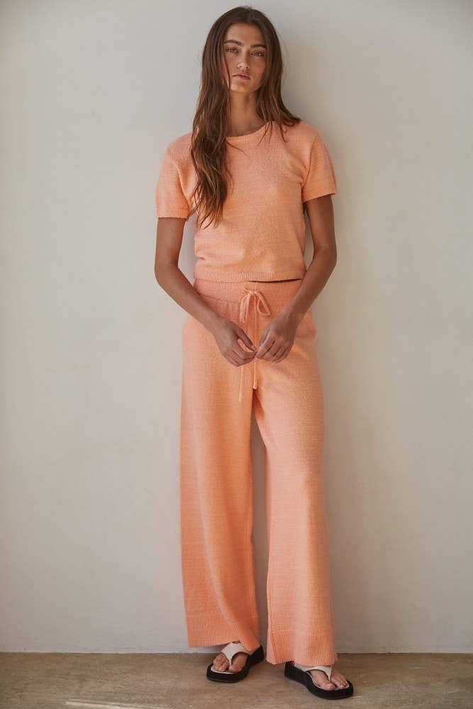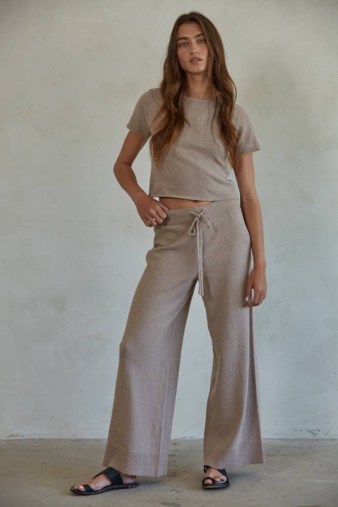 This short-sleeve crop top pairs effortlessly with the knit sweater wide leg pant in dusty sage. This top has a chic classic round neckline for an elegant look to wear casual or for an evening out.